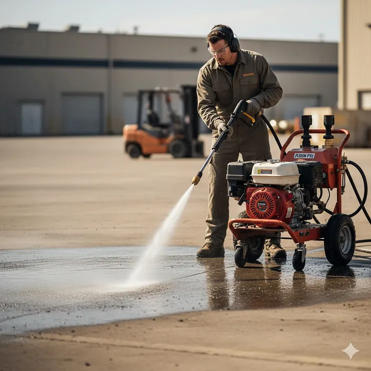 Surface preparation before coating or sealing requires aggressive cleaning removing laitance, curing compounds, and contaminants. A 6000 psi pressure washer with surface cleaning attachment can prepare 3,000-5,000 square feet per hour depending on surface condition—impossible with lower-pressure alternatives.